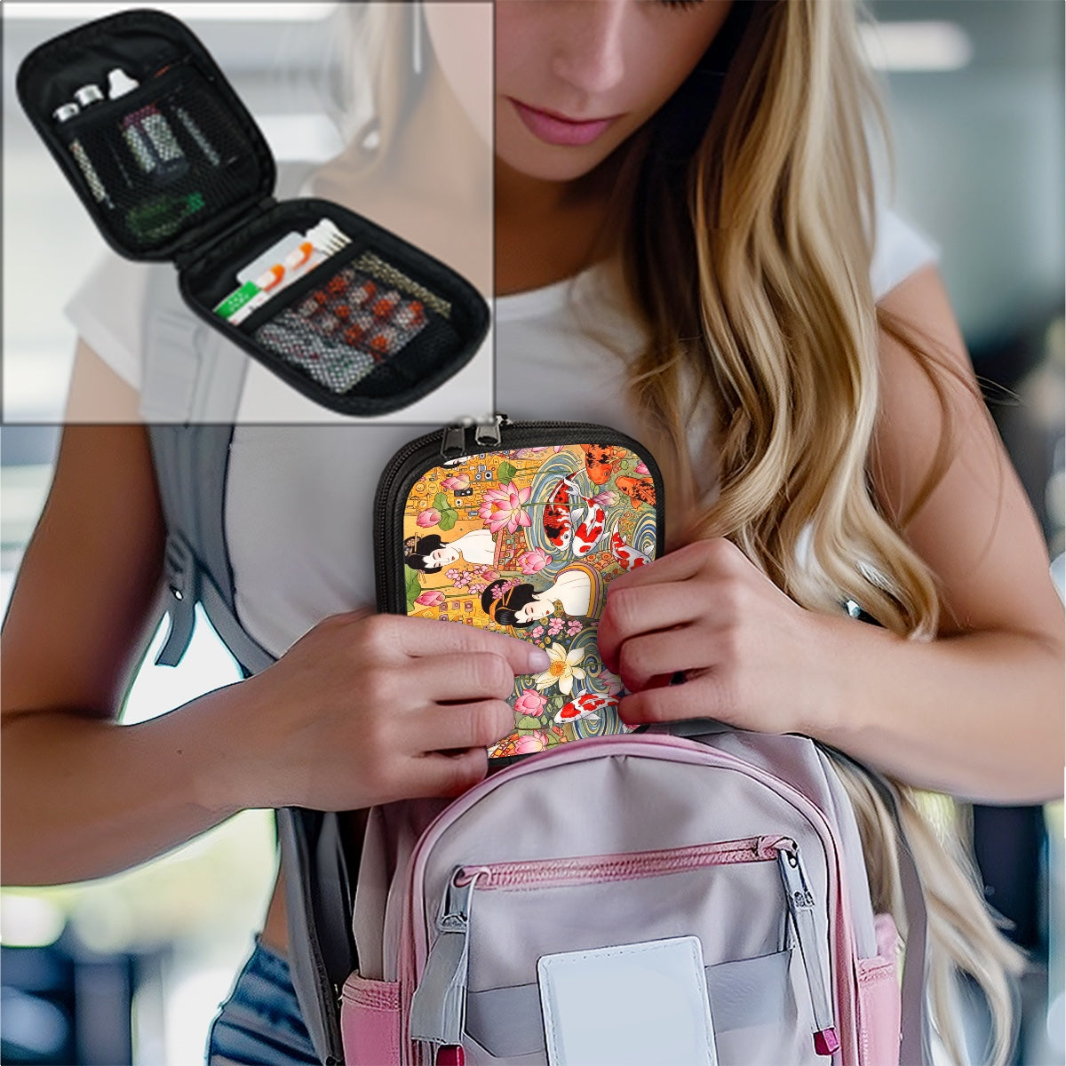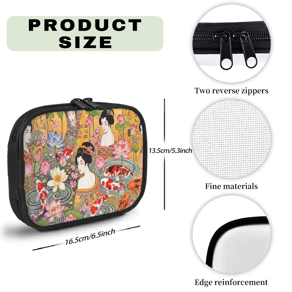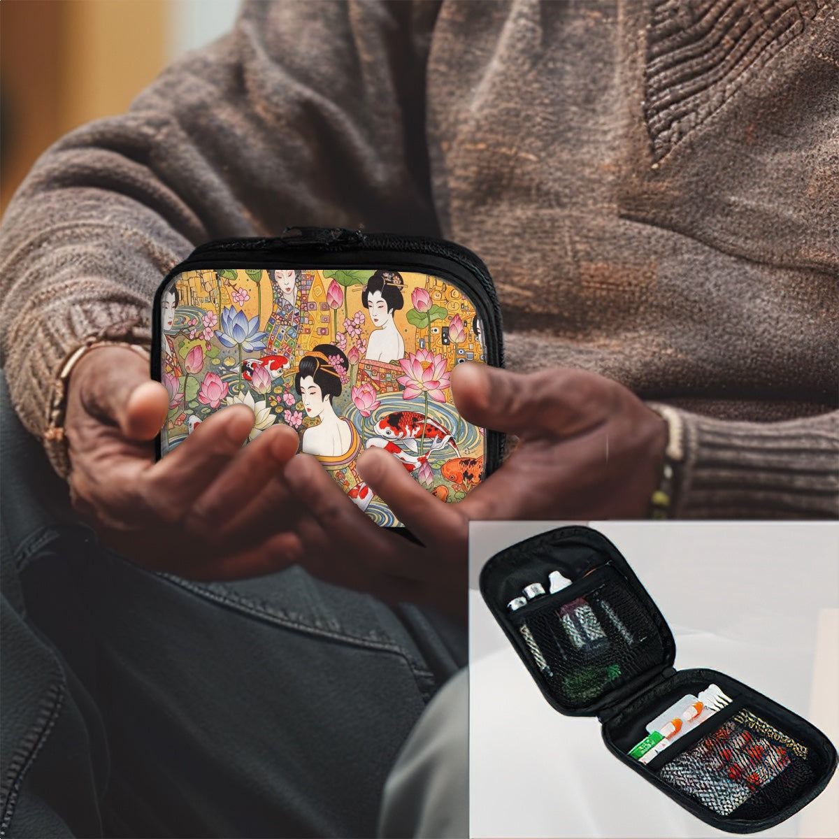 The kit’s design showcases a single sublimation print on top, featuring vibrant koi fish, graceful geisha, and delicate lotus flowers set against a luxurious gold-tone background—melding traditional Japanese artistry with a modern aesthetic that appeals to the traveling and multi-tasking woman that wants to stay organized. Its thick, fade-resistant fabric ensures your items are well-protected, while the comfortable material adds a touch of sophistication to your travel essentials.
